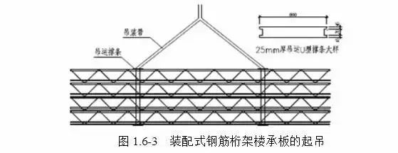 起吊时,钢筋桁架楼承板下面和上面应设带有U型卡口吊运木制撑条,防止钢筋桁架楼承板变形,偏斜等问题。吊装应设置两个吊装带,间距1.6m,吊装带应设在桁架中部,保持起吊过程中楼承板两端平衡,如图所示。